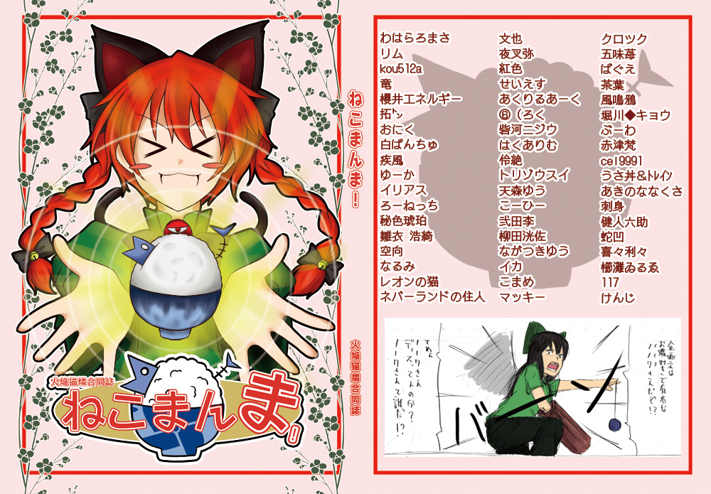 今回発行いたしました、お燐合同誌「ねこまんま!」ですが、10月17日に行われる東方名華祭にてC-06「星空華劇団」さんとE-07「バイタルエリア」さんのところでお燐合同誌「ねこまんま!」を少数ですが委託します!紅楼夢にいけなかった方は是非こちらでご購入ください!